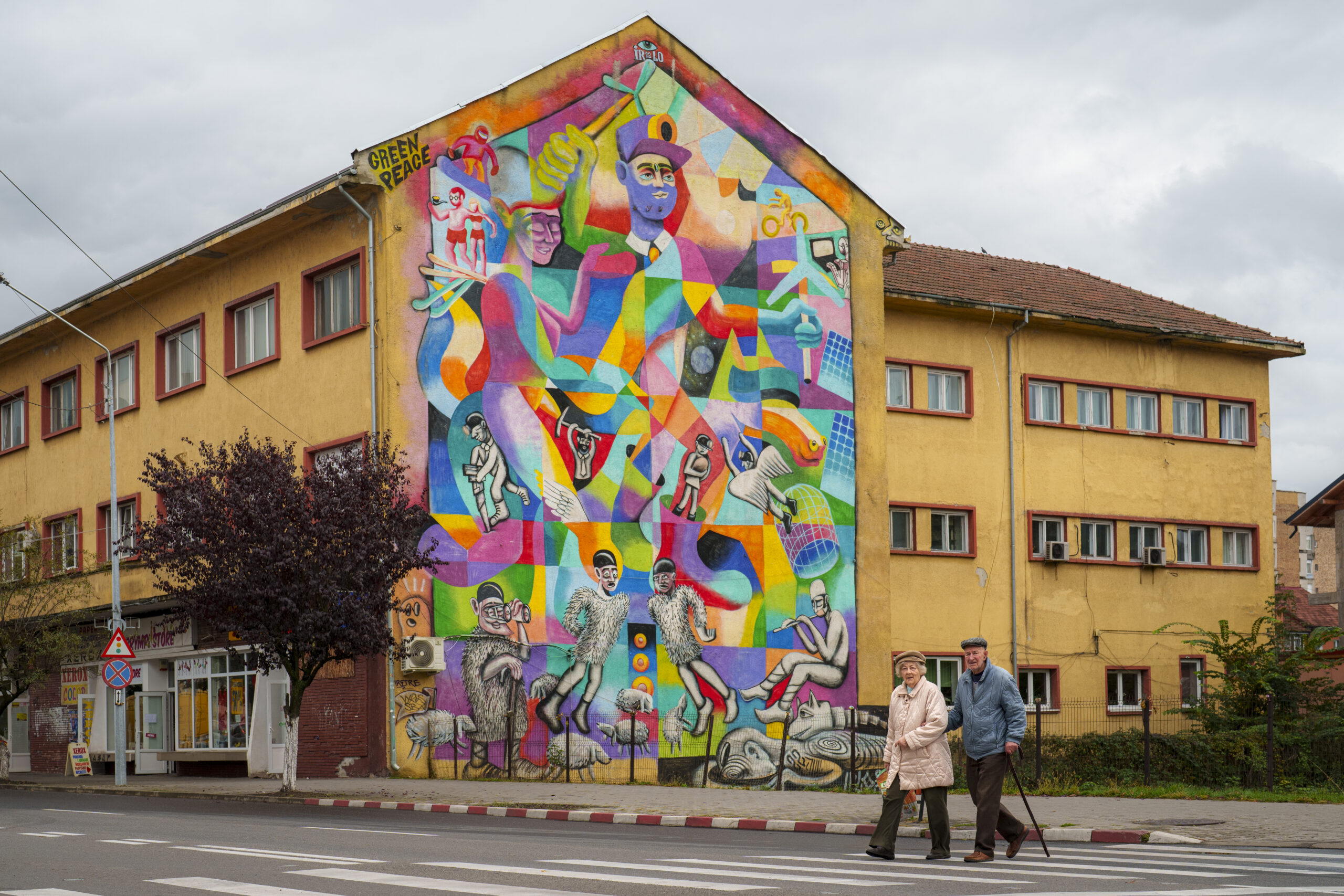 People cross a street backdropped by a mural by Romanian artist IRLO in Petrosani, southern Romania, Friday, Oct. 11, 2024. The mural depicts the evolution of the Jiu Valley, Romania’s coal mining region as steps are taken to move away from coal based energy production to green energy solutions. Photo by: AP Photo/Vadim Ghirda.