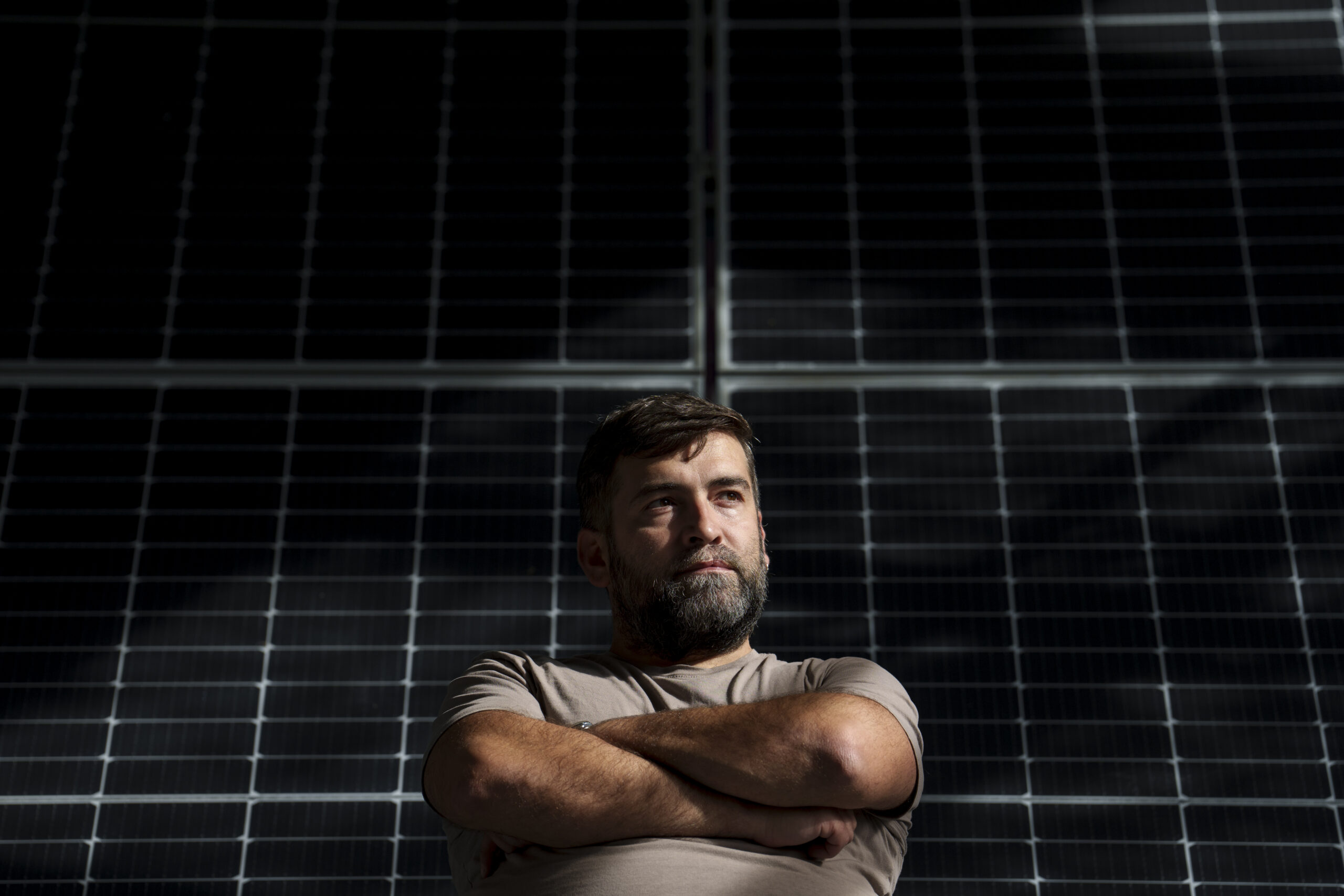 Sebastian Tirinticǎ sits backdropped by solar panels in the RenewAcad training center in Petrosani, southern Romania, Friday, Oct. 11, 2024. Photo by: AP Photo/Vadim Ghirda.