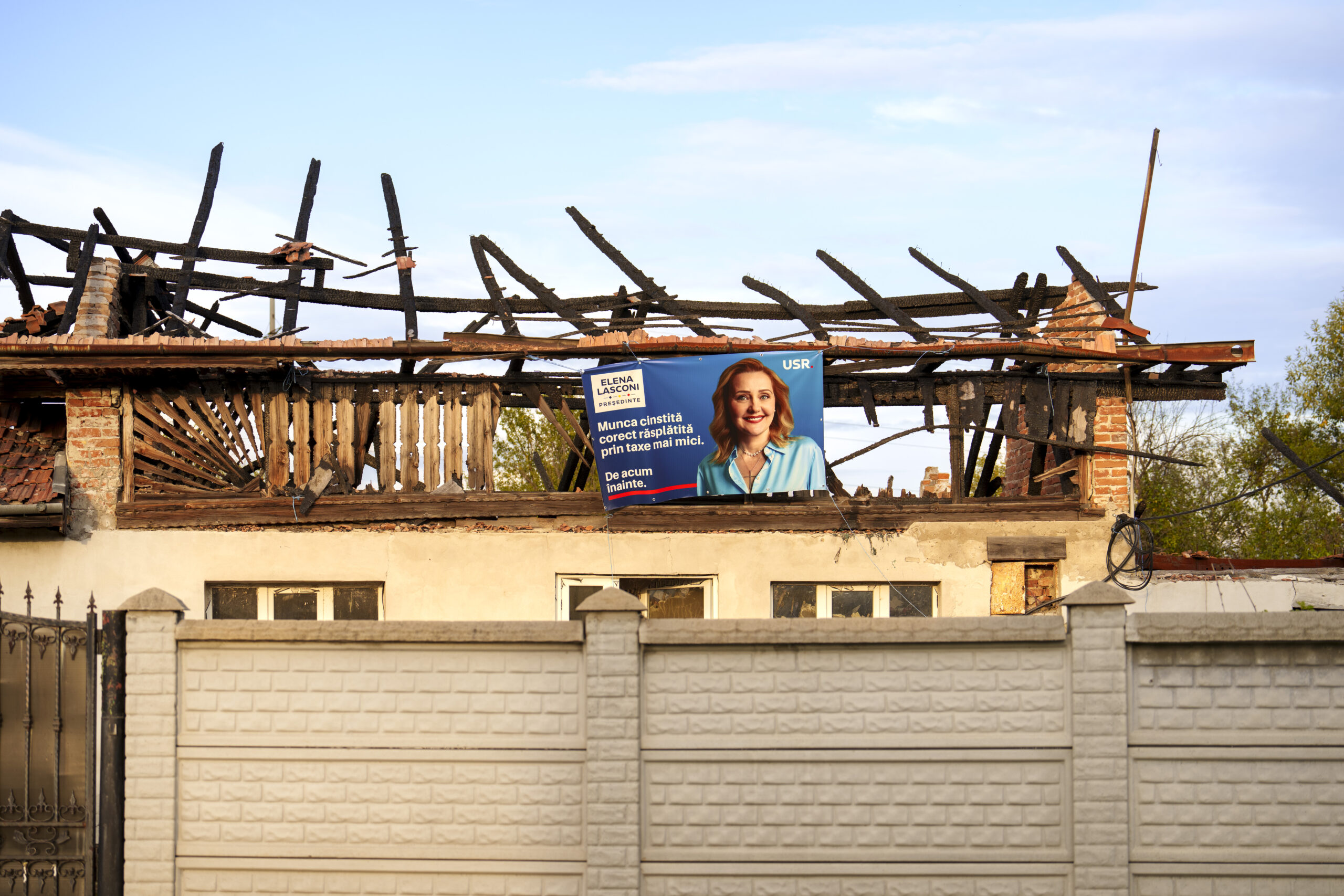 An electoral poster of presidential candidate Elena Lasconi is placed on a fire damaged building in Farcasesti Mosneni, southern Romania, Friday, Oct. 11, 2024. Photo by: AP Photo/Vadim Ghirda.