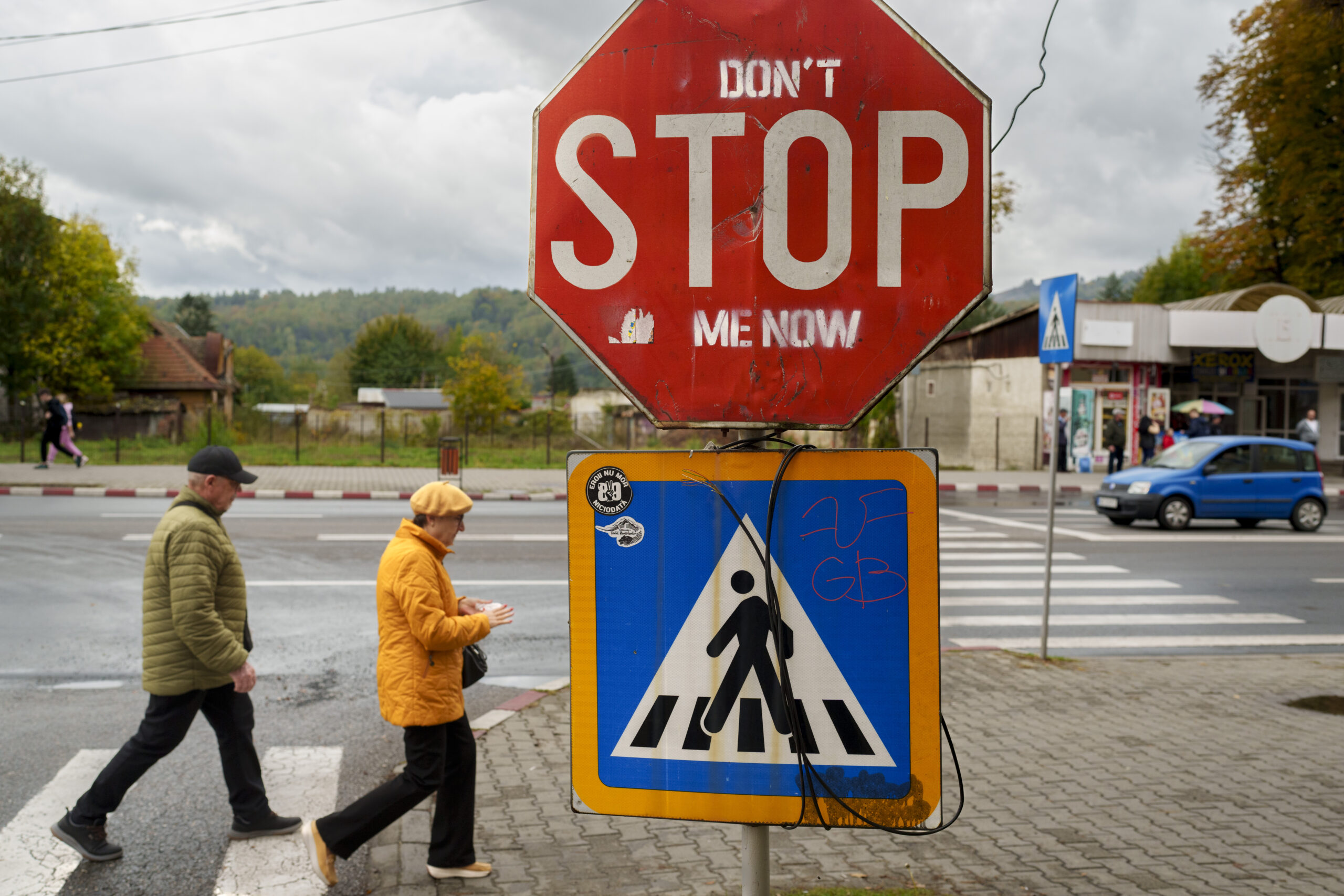 People cross a street in Petrosani, southern Romania, Friday, Oct. 11, 2024. Photo by: AP Photo/Vadim Ghirda.