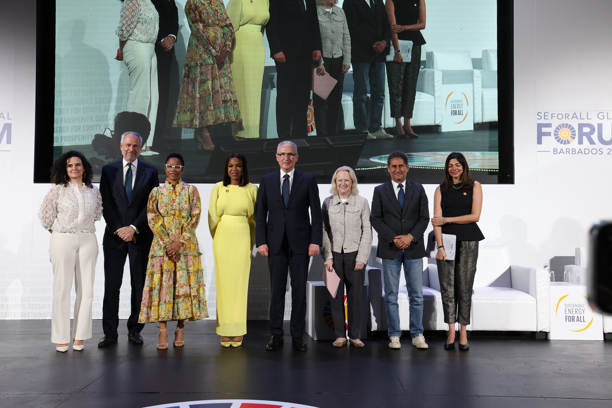 From L to R: Mafalda Duarte, executive director of the Green Climate Fund; Brazil’s Corrêa do Lago; Senator Lisa Cummins, Barbados’ energy minister; Damilola Ogunbiyi, CEO of SEforALL; Babayev; Mary Schapiro, vice chair and head of the secretariat for the Glasgow Financial Alliance for Net Zero; Francesco La Camera, director general of the International Renewable Energy Agency; and Kanika Chawla, chief of staff and director of external programs at SEforALL. The Sustainable Energy for All Forum, Bridgetown, Barbados, March 2025. Photo credit: SEforALL.