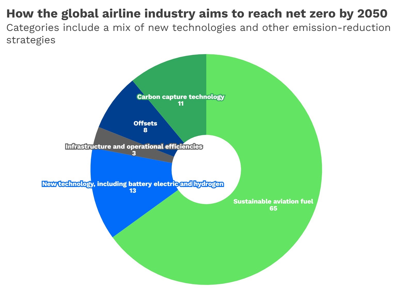 Airlines estimate they will likely depend on SAF for 65% of their emissions reductions toward a net-zero goal in 2050, according to a climate strategy IATA released in October 2021. Thatâs compared to 13% with new electric and hydrogen technologies. Carbon offsets, which are estimated to make up a whopping 97% of the industryâs emissions reductions through at least 2025, are set to decline to just 8% by 2050.