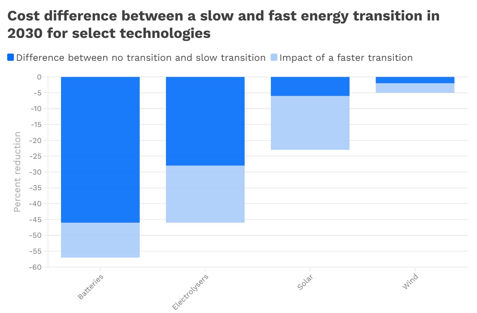 The above chart shows how a transition with less collaboration could be slower. The chart below shows how much more affordable a faster transition, enabled by more collaboration, could be compared to a slower transition, for select technologies.