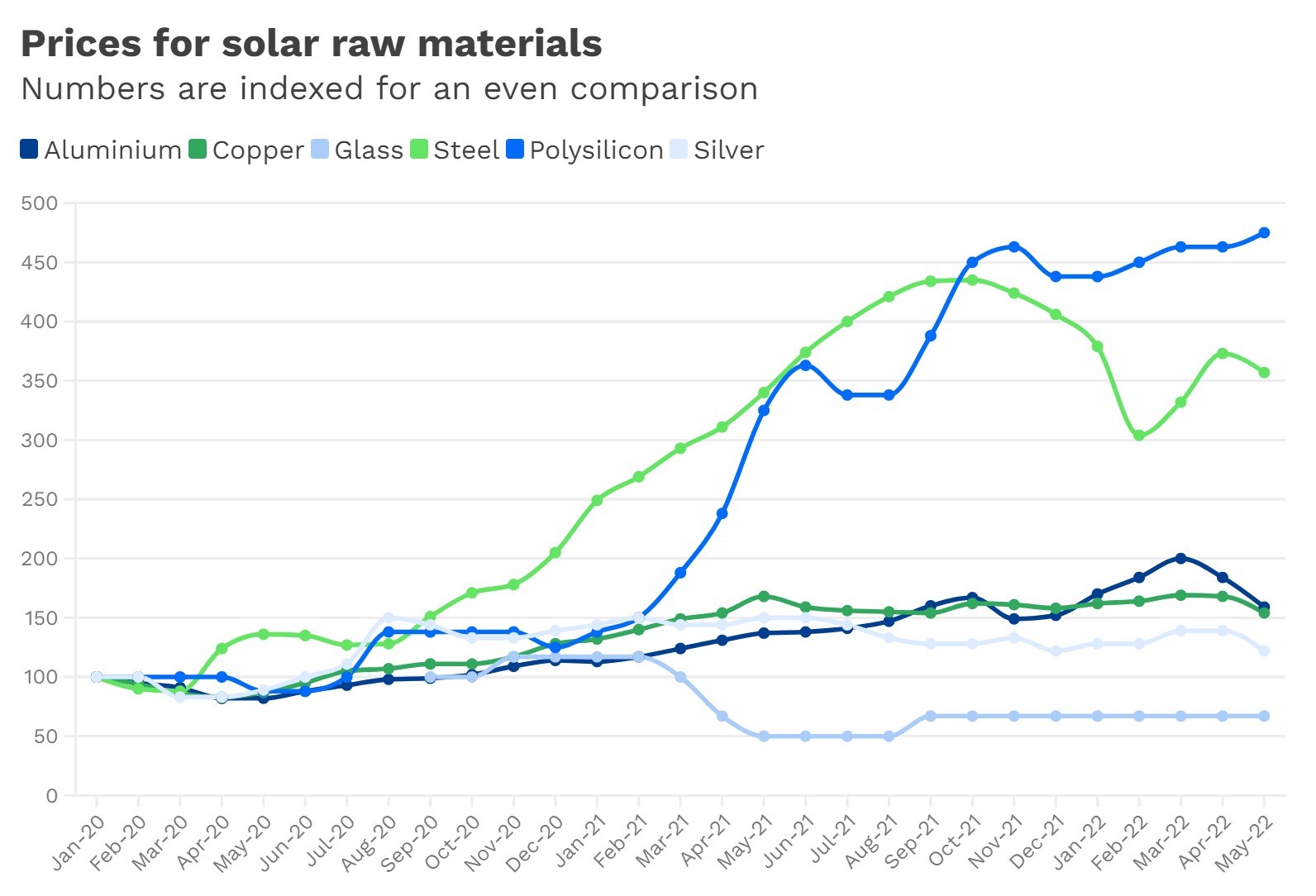 Polysilicon, the main raw material for producing solar cells that mostly comes from China, tripled in price over the last year and a half, according to an analysis from consultancy Wood Mackenzie. The prices for other raw materials needed in solar panels, such as steel or aluminum, have begun decreasing slightly in the last month, but they are still considerably above their 2019 levels.
