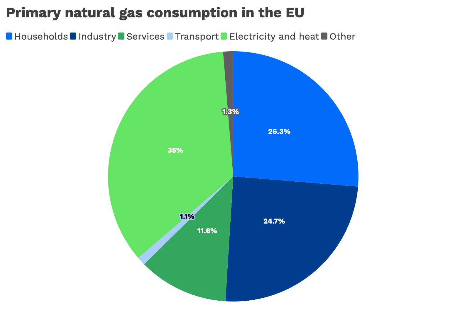 At the residential level, millions of Europeans rely on natural gas for heating and cooking. On average, gas provided 40% of space heating, 40% of water heating and 30% of energy used for cooking in the EU’s households in 2019, according to the EU’s official statistical body Eurostat.