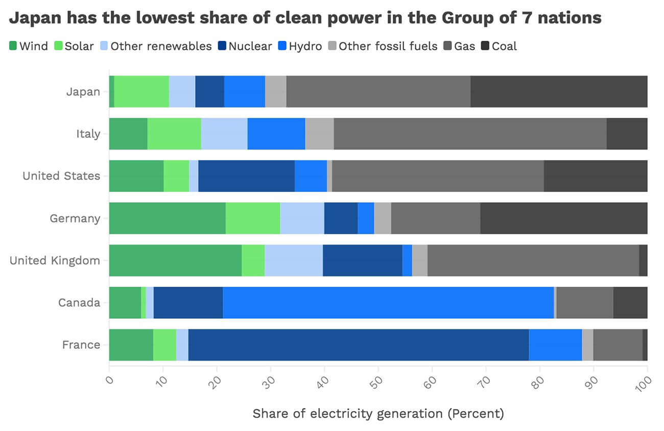 Japan has the highest share of coal generation for electrical power (33%) in the G7 along with the lowest share of wind power — 1% compared to 11% on average for G7 countries, according to a recent Ember report. In an April communique, climate, energy and environmental ministers from the G7 targeted 150 gigawatts (GW) of new offshore wind by 2030, but Japan aims to have only 5.7 GW up and running by then, just 4% of the G7 goal.
