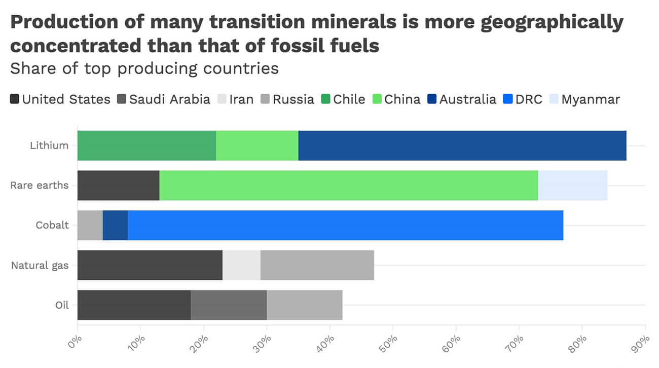 The Democratic Republic of the Congo alone produces 70% of the world’s cobalt, and just three countries account for nearly 90% of global lithium production: Australia, Chile and China. A similar pattern exists for platinum, rare earth elements and graphite.