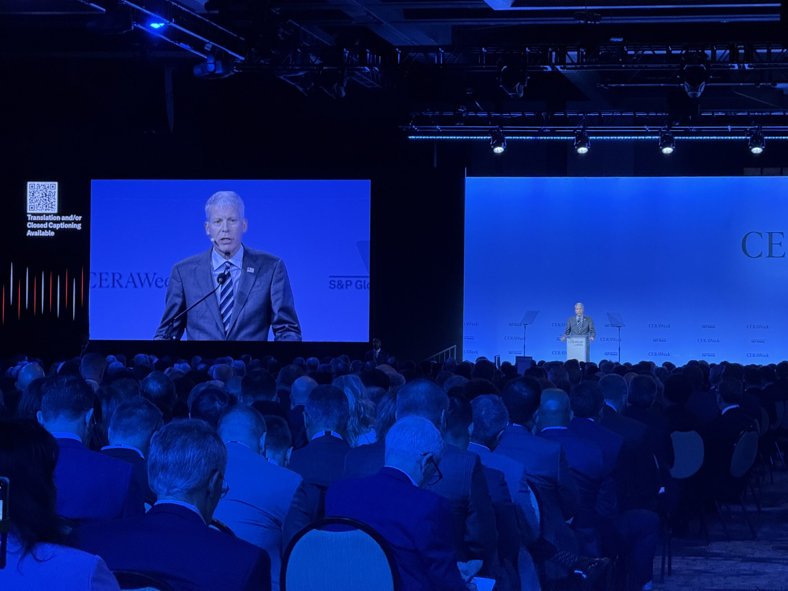 U.S. Energy Department Secretary Chris Wright addresses attendees at the opening session of CERAWeek by S&P Global in Houston on March 10, 2025. Photo by Bill Spindle.