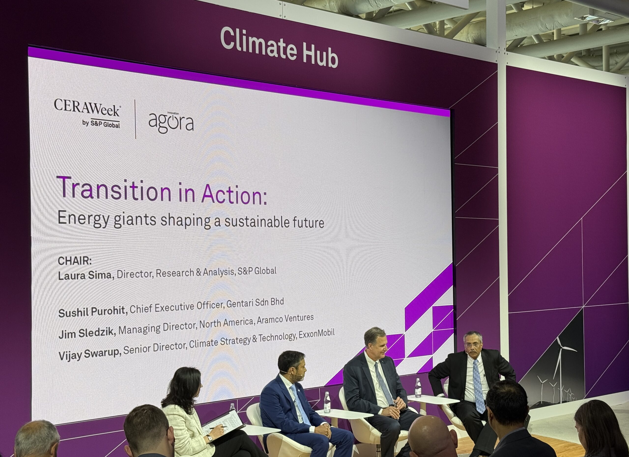 A panel discussion on how energy giants can shape a sustainable future at CERAWeek by S&P Global in Houston on March 10, 2025. The speakers include Laura Sima, director of research and analysis at S&P Global; Sushil Purohit, chief executive officer of clean energy company Gentari Sdn Bhd; Jim Sledzik, managing director, North America for Aramco Ventures, the venture arm of Saudi Arabia’s state-owned oil company; and Vijay Swarup, senior director of climate strategy and technology at oil major ExxonMobil.