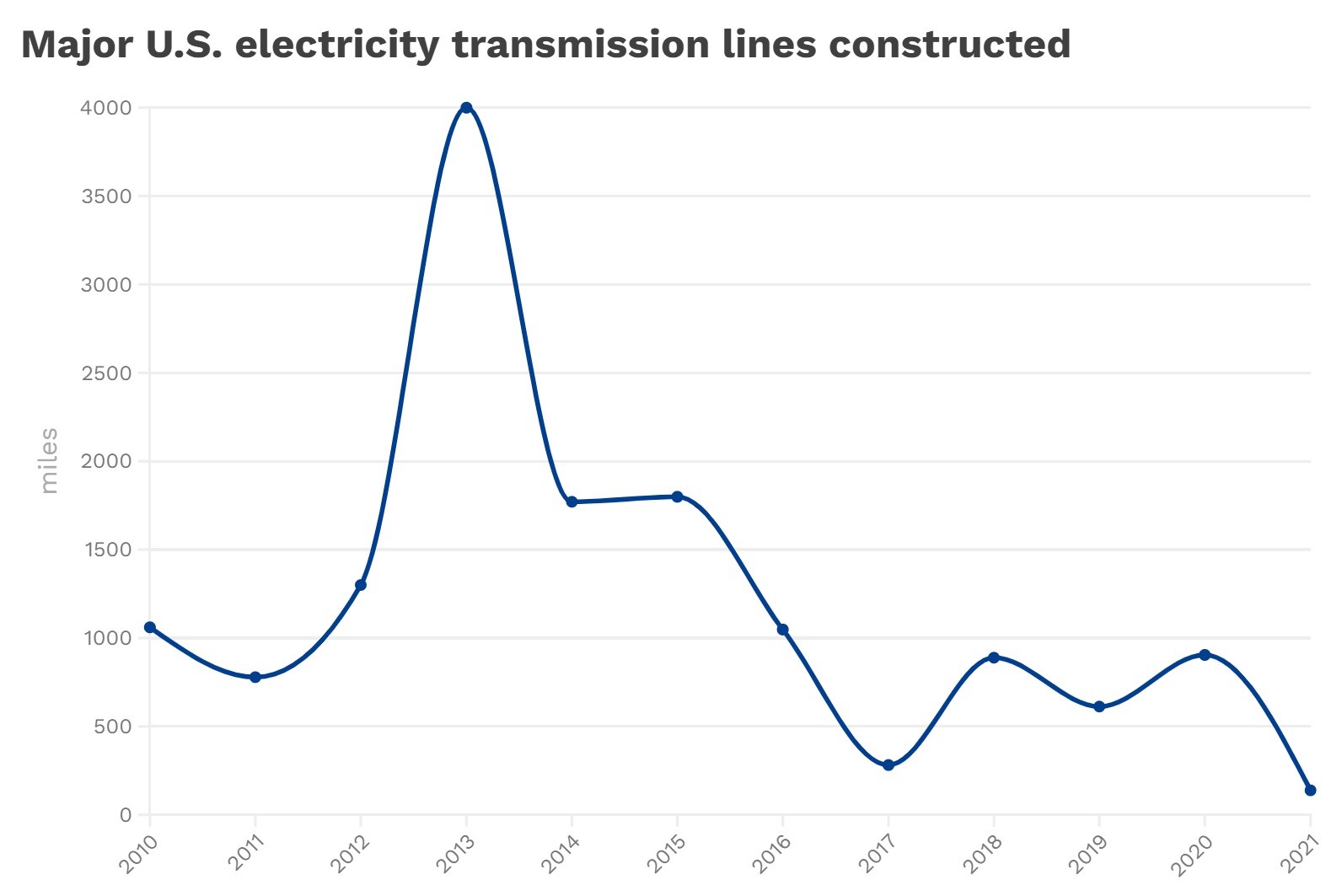 The average miles of power lines built annually between 2010 and 2015 was more than 1,700, compared to less than 650 miles between 2016 and 2020, according to federal data analyzed by consulting firm Grid Strategies.