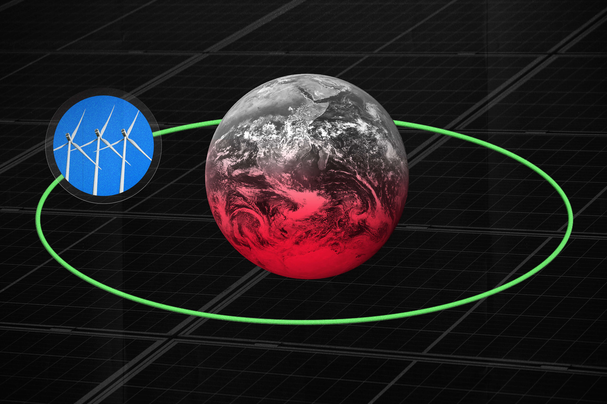 An illustration of the white house surrounded by energy icons — solar panels, wind turbines, hydrogen tanks — and president elect Donald Trump smiling.
