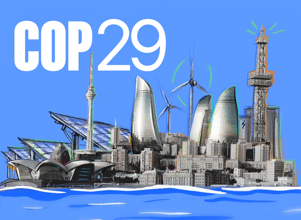 Line drawing of cat with head turned, sitting next to a microphone and a stack of notebooks, with the COP29 logo in the background.